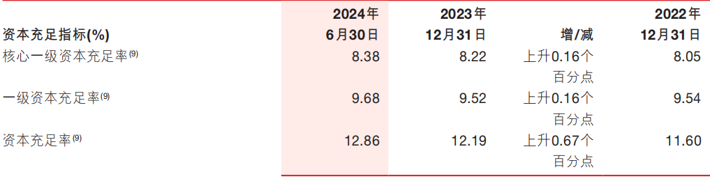 截至2024年6月末,浙商银行资本充足率、一级资本充足率、核心一级资本充足率分别为12.86%、9.68%、8.38%,较上年末分别上升0.67个百分点、0.16个百分点、0.16个百分点。