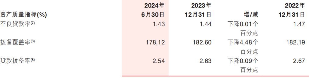 具体看,截至2024年6月末,浙商银行不良贷款257.67亿元,比上年末增加11.71亿元,不良贷款率1.43%,比上年末下降0.01个百分点,其中公司不良贷款率1.38%,较上年末上升0.01个百分点;个人不良贷款率1.85%,较上年末下降0.06个百分点。拨备覆盖率178.12%,较上年末下降4.48个百分点。