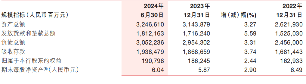 截至2024年6月末,浙商银行资产总额32466.1亿元,较上年末增长3.27%,其中发放贷款和垫款总额18121.63亿元,较上年末增长5.59%,占资产总额的54.46%;负债总额30522.36亿元,较上年末增长3.31%,其中吸收存款19384.79亿元,较上年末增长3.74%。