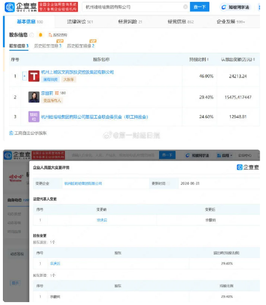 正文 宗馥莉全面接手杭州娃哈哈集团公司 万生优配 V管理员 /2024-08-31 14:08:04/144阅读/0评论 0831 此篇文章发布距今已超过403天,您需要注意文章的内容或图片是否可用! 企查查APP显示,近日,杭州娃哈哈集团有限公司发生工商变更,宗庆后卸任法定代表人,董事长兼总经理职务,均由宗馥莉接任。同时,张晖、吴建林等多名高管退出董事、监事职务,新增叶雅琼、费军伟等为董事,王国祥为董事兼副总经理。企查查股权穿透显示,宗庆后退出股东行列,杭州娃哈哈集团有限公司现由宗馥莉、杭州上城区文商旅投资控股集团有限公司、杭州娃哈哈集团有限公司基层工会联合委员会(职工持股会)3名股东共同持股。