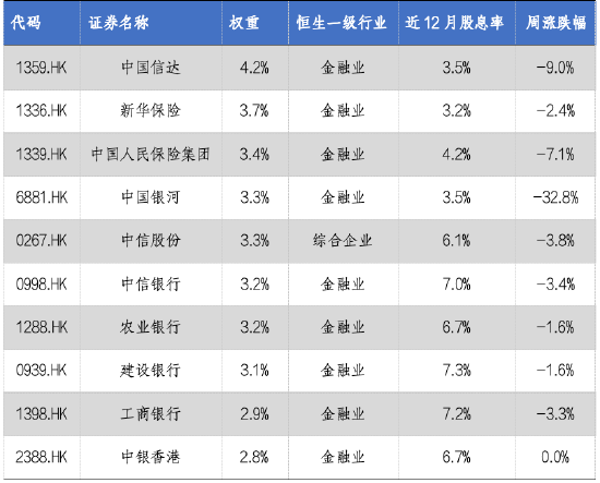 过去一周(10月7日-10月11日)港股指数普遍下跌,红利跌幅较小,跌幅主要由于前期短期内经历大幅上涨,部分资金获利了结:恒生港股通中国央企红利全收益指数下跌5.88%,恒生全收益指数下跌6.53%,恒生科技全收益指数下跌9.39%。行业方面,所有恒生一级行业普跌,高股息板块如电讯业与公用事业跌幅较小。