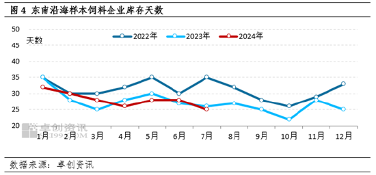 其次,东南沿海地区下游企业由于前期市场价格持续走弱,以及受期货影响对后市的看空情绪,采购积极性较弱,企业加工库存持续减少,截至7月底东南沿海下游饲料企业现货库存平均天数在25天以内,部分企业库存不足15天,已经低于正常采购周期。