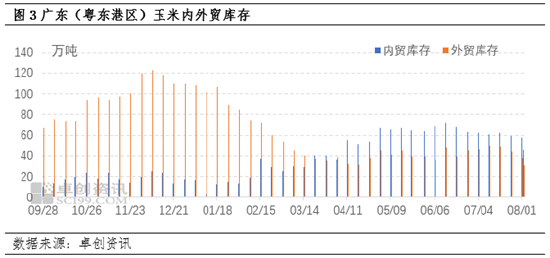 库存方面,首先自7月开始北方港口贸易集港量持续低位,以贸易自主集港消化港内库存为主,整体库存量高于去年同期,截至8月9日,北方四个主要玉米贸易港口的库存总量约300万吨,高于去年同期接近46%。但南方广东港(粤东港区)截至8月8日内贸外玉米库存总量约77.2万吨,较7月末下降约25%。北港库存宽裕,而南港库存减少,其原因主要是南北港贸易持续倒挂所致,而随着南港库存减少,对贸易环节报价以及心态均有一定支撑。
